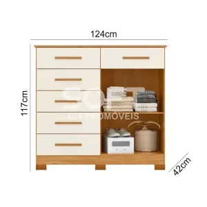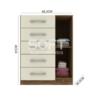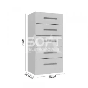 Material Principal: MDP de 12mm Puxador ABS: 05 Gaveta com corrediças plásticas: 05 Dimensões Altura: 91 cm Largura: 46 cm Profundidade: 38,5 cm Garantia: 03 meses