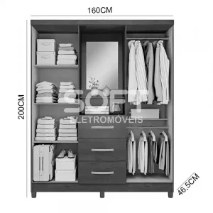 Material Principal: MDP Porta de abrir: 3 Puxadores em MDF: sim Dobradiças metálicas: sim Corrediças metálicas: sim Cabideiros em aluminio: sim Pés: não Dimensões Altura: 204 cm Altura com pés: 210 cm Largura: 82 cm Profundidade: 46 cm Garantia: 03 meses
