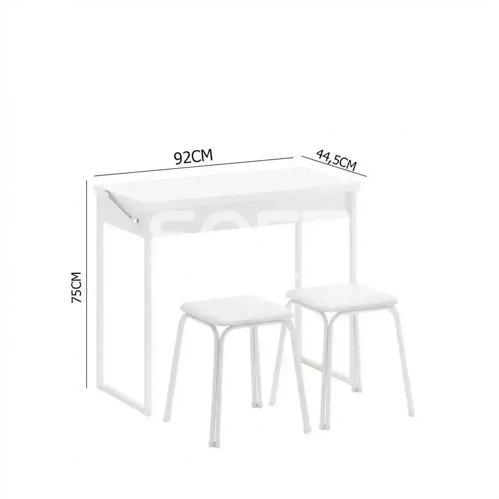 O Conjunto Sala de Jantar é composto por uma mesa dobrável e duas banquetas