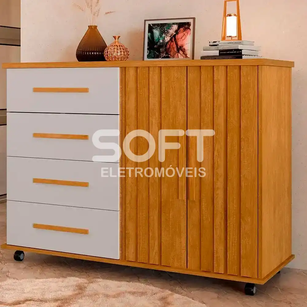 A Cômoda Lady da J & A é uma peça moderna e funcional, ideal para compor ambientes sofisticados e bem organizados. Ela combina acabamento ripado com tons neutros para um visual elegante.